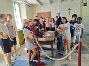 Le lundi nous nous sommes adaptés à la forte chaleur. Nous avons marché par équipes jusqu’à un moulin à eau, dans un lieu ombragé. Première découverte pour certains jeunes : une messe en plein air, dans une église à « ciel ouvert ». Un jeune a dit : « je ne savais pas que c’était possible, c’est top l’ambiance chez les cathos ». Puis des bénévoles, des passionnés, nous ont fait visiter le moulin et le musée et ont même fait fonctionner la roue. Les jeunes ont pu renouveler les vœux de leur baptême grâce au Père Xavier Laporte-Weywada. Nous avons